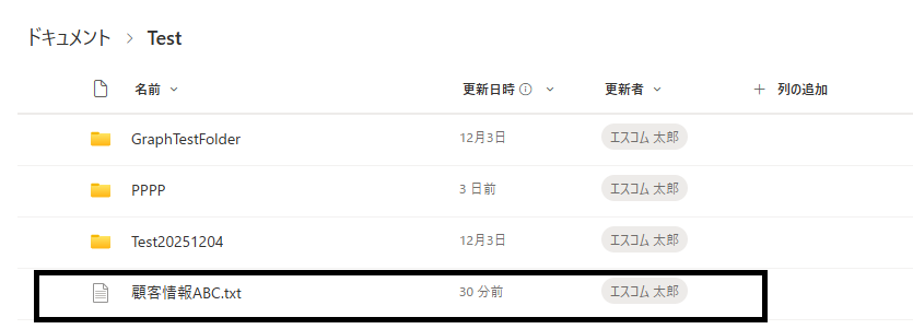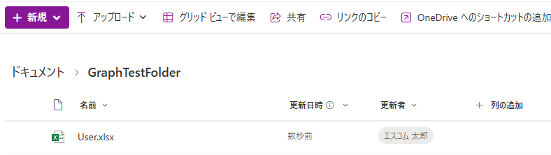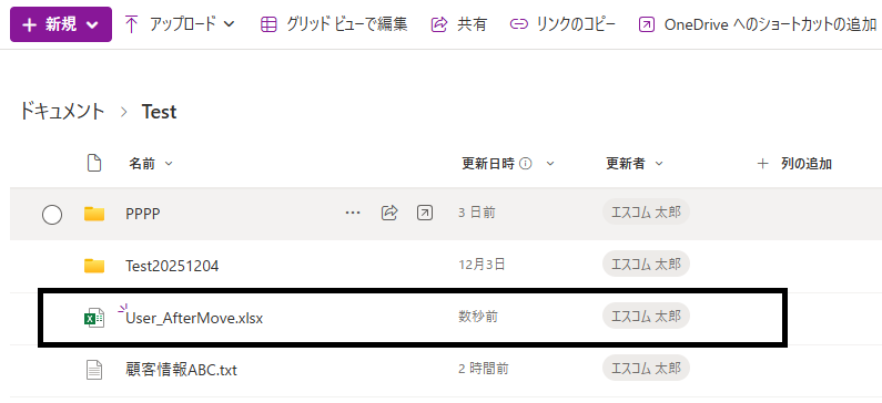 リクエストボディに設定した対象フォルダーTestの配下にUser_AfterMove.xlsxで移動されていることが確認できます。