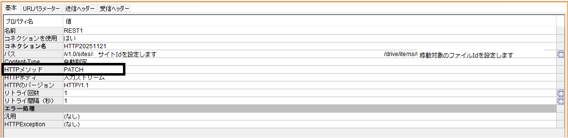 パス:「/v1.0/sites/{サイトID}/ drive/items/移動対象のファイルId」を設定してください。
