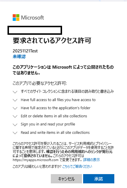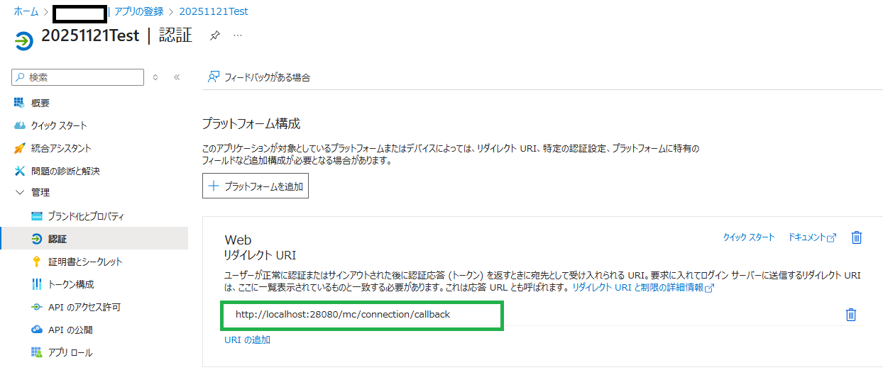 このコールパックURLはMicrosoft Azureの対象アプリの認証の「WebリダイレクトURI」に設定したURIと一致する必要があります。