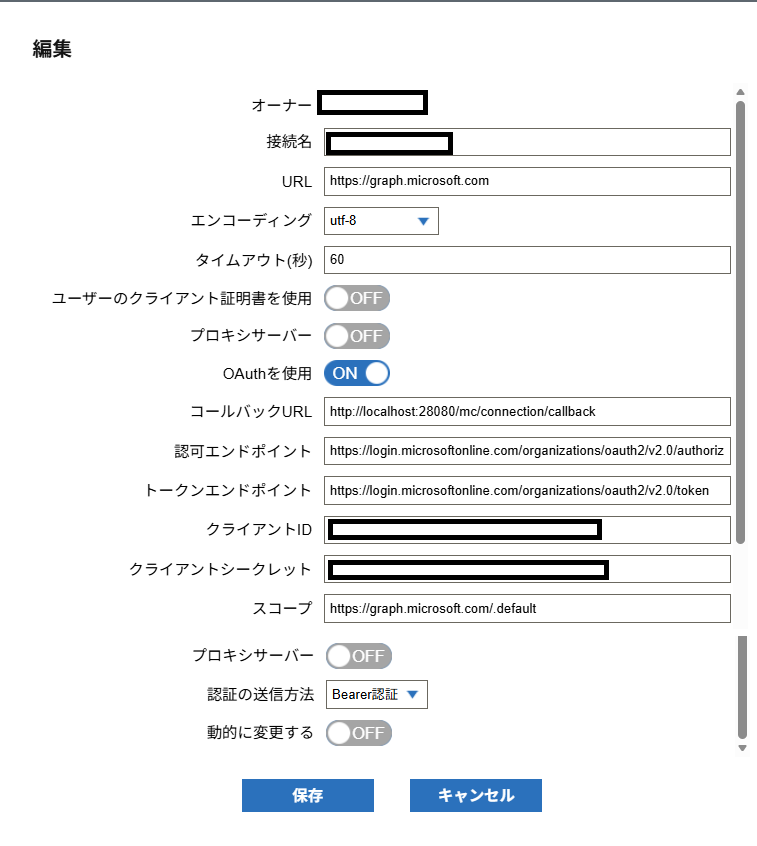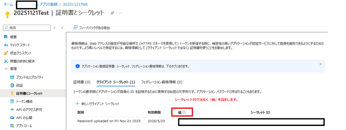 クライアントシークレット:Microsoft Azureの対象アプリの証明書とシークレットのクライアントシークレットの値を設定します。