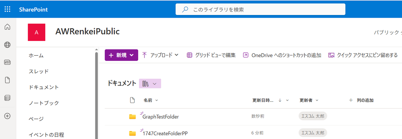 下図のようにGraphTestFolderが作成されたことを確認できます。
