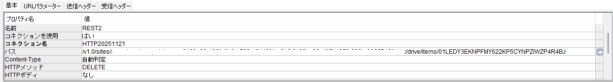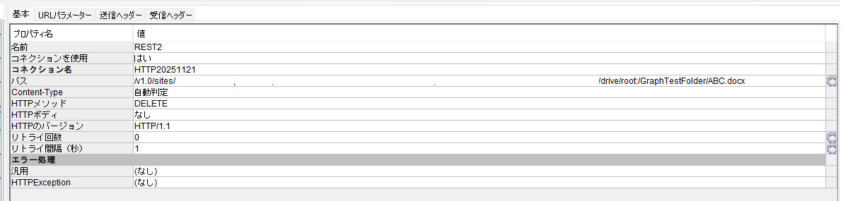 REST コンポーネントでMicrosoft Garph APIにアクセスし、SharePoint の特定サイトにあるフォルダーまたはファイルを削除します。このコンポーネントを使用するには HTTP コネクションが必要となるため、事前に HTTP コネクションを作成します。