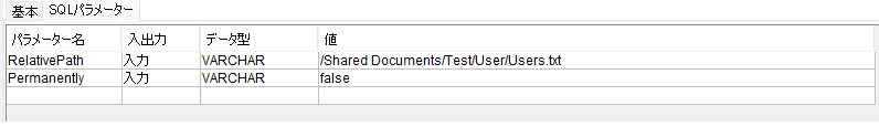 パラメーター名にDeleteDocumentストアドプロシージャに必要なRelativePathとPermanentlyを設定します。