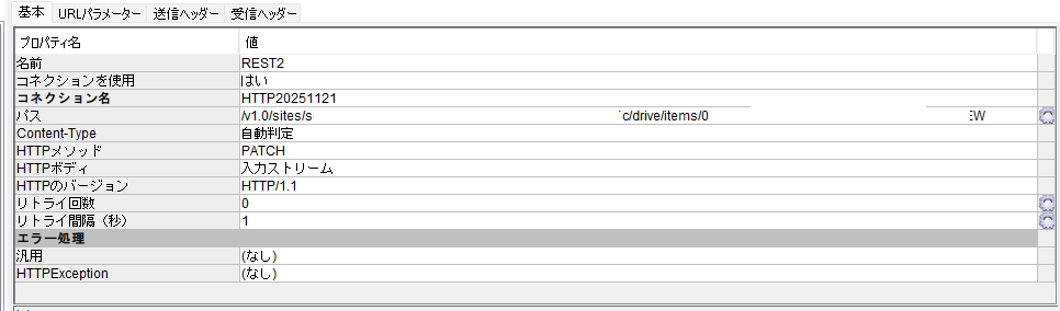 REST コンポーネントを使用して Microsoft Graph API にリクエストを送信し、SharePoint のファイル名を変更します。このコンポーネントから Microsoft Graph API にアクセスするには HTTP コネクションが必要となるため、事前に HTTP コネクションを作成します。