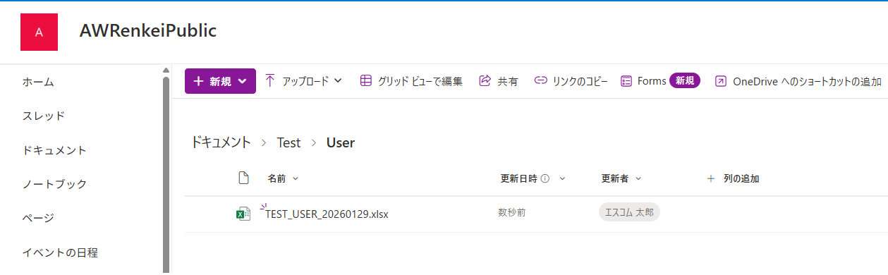 例:ファイル名をtest_user.xlsxからTEST_USER_20260129.xlsxに変えます。