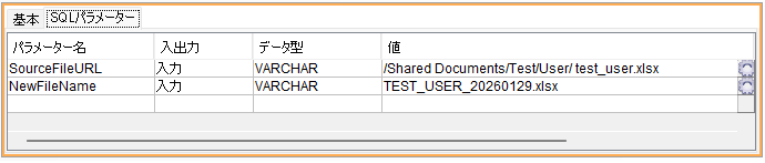 パラメーター名にRenameAttachmentOrDocumentストアドプロシージャに必要なSourceFileURLとNewFileNameを設定します。