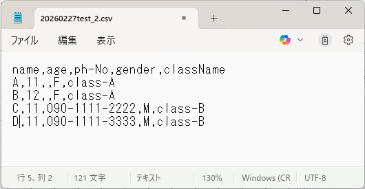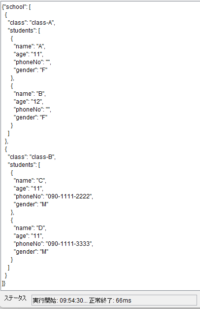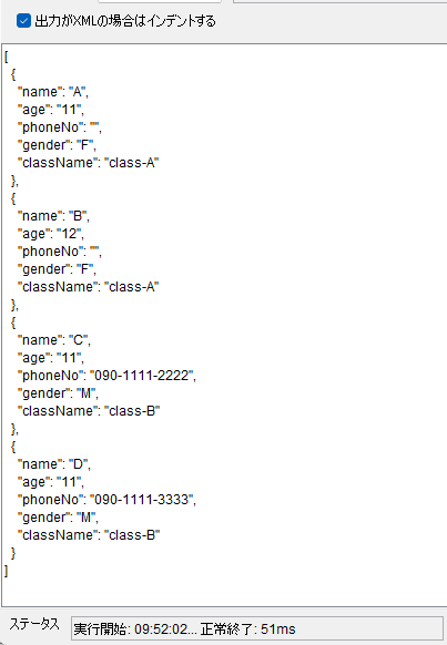 ConverterコンポーネントによるCSVからJSONへの変換では、JSON特有の階層構造(親子関係)を構築することができません。そのため、CSVの各行がそれぞれ独立した1つのオブジェクトとして出力されるシンプルなフラット配列の構造となります。
