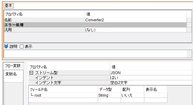 ※Converterコンポーネントでは、出力ストリームのフィールド定義(階層構造など)が変換結果に反映されないため、詳細な設定を行う必要はありません。