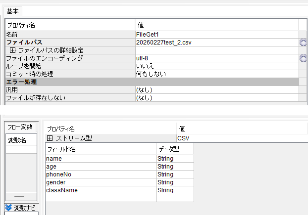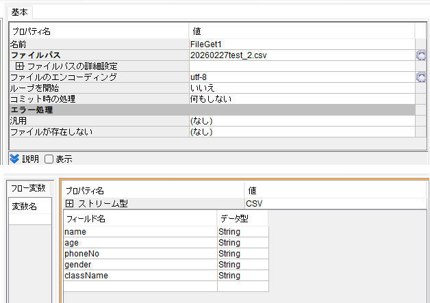 ・FileGetコンポーネントのストリーム定義は読み込むcsvファイルの項目名と対応するフィールド名を設定します。
