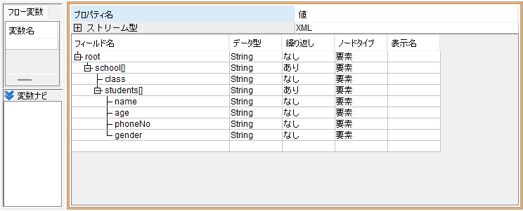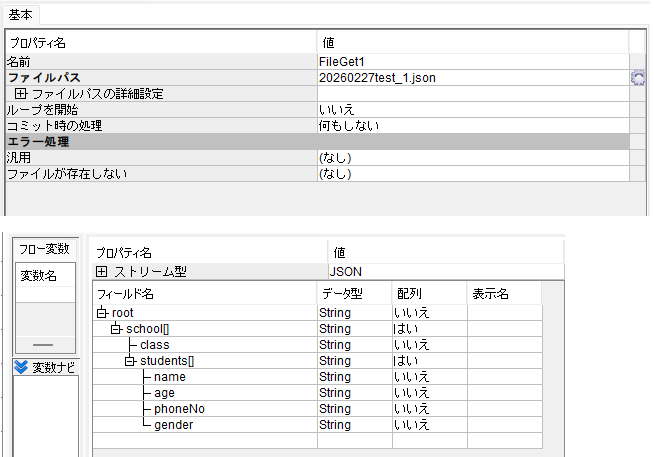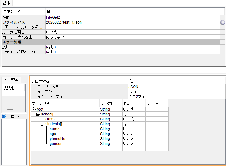 ・FileGetコンポーネントのストリーム定義は読み込むJSONデータの構造に対応するように設定します。
